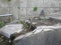実は、階段の横は、花壇というか畑というか……植栽があって、段々畑みたくなってる。階段が曲がりくねっていて、上側の植栽の排水が階段部に流れる様になっている。